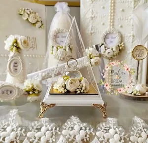 در کنار تمام موارد گفته شده عضو مهم در وسایل ست بله برون دستهگل است که با یک دیزاین خاص میز بله برون را زیباتر میکند. جا حلقهای، شمع برای تزئین، چاقوی برش کیک، تعدادی شاخهنبات و کله قند و قندشکن برای شکستن قند هم همراه با وسایل بله برون خریداری میشود.